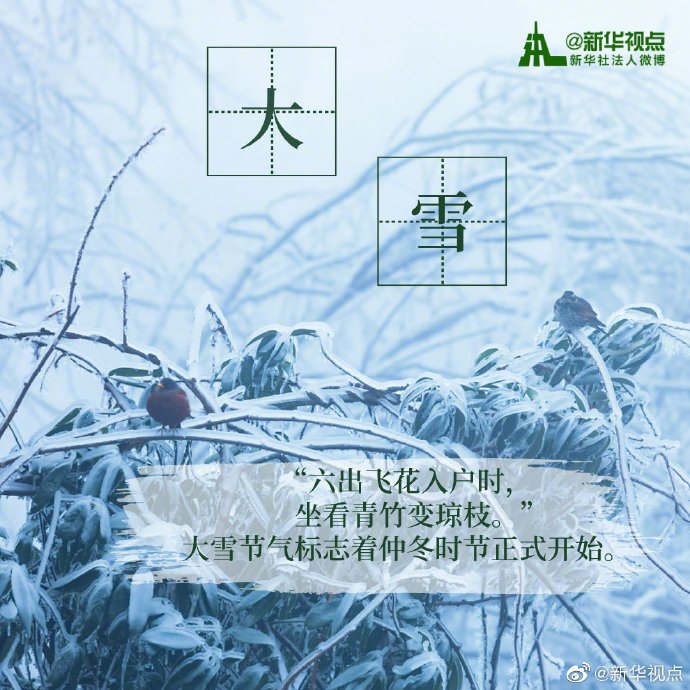 “白雪紛紛何所似?未若柳絮因風(fēng)起。”今天18時(shí)18分迎來“大雪”節(jié)氣。相較于“小雪”節(jié)氣,“大雪”節(jié)氣時(shí),氣溫不斷下降,雪量不斷增大,下雪天數(shù)不斷增加。天氣漸冷,注意添衣保暖。?