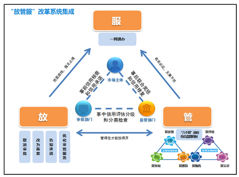 注重系統集成,突出協同高效。“大道至簡,實干為要。”回顧上海市浦東新區“證照分離”改革歷程,始終堅持以“減證”促“簡政”,在行政審批上做“減法”,把“放手”當作最大的“抓手”,同時加強事中事后監管,堅持“放手”但不“甩手”,持續推進政府職能深刻轉變。在“放”的方面,著重體現“一個轉變、兩個確立”:一個轉變即轉變審批管理模式,從重事前準入審核轉為重事中事后監管;兩個確立即確立清單管理制度,將涉企經營許可事項全部納入清單管理,清單之外,企業取得營業執照即可自主開展經營;確立“四扇門”改革方式,取消審批的注重協同配套,改為備案的注重當場辦結,告知承諾的注重信用支撐,優化審批服務的注重簡便透明。在“管”的方面,探索確立了“雙告知、雙反饋、雙跟蹤、雙隨機、雙評估、雙公示”的“六個雙”政府全程閉環綜合監管新模式。在“服”的方面,強化“互聯網+政務服務”融合創新,推動政府管理創新與信息技術深度融合,依托“一網通辦”推進政務服務扁平化、便捷化、智能化,讓數據多跑路、群眾少跑腿。(見下圖)