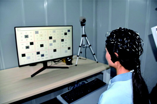 在天津大學(xué)某實驗室內(nèi),一塊布滿字符和符號的屏幕上,黑色方塊頻繁閃爍。一名男生佩戴著布滿靈敏電極的黑色腦電極帽,緊盯屏幕,在無需雙手操作的情況下,通過“意念”“隔空打字”,將字符輸入指定區(qū)域。