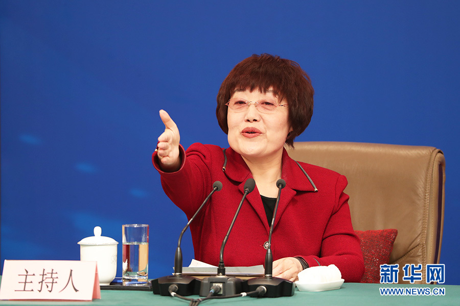 十三屆全國人大二次會議新聞中心3月9日(星期六)15時在梅地亞中心新聞發布廳舉行記者會,邀請國務院國資委主任肖亞慶,副主任翁杰明,秘書長、新聞發言人彭華崗就“國有企業改革發展”相關問題回答中外記者提問。圖為記者會主持人。新華網/中國政府網 陳杰 攝