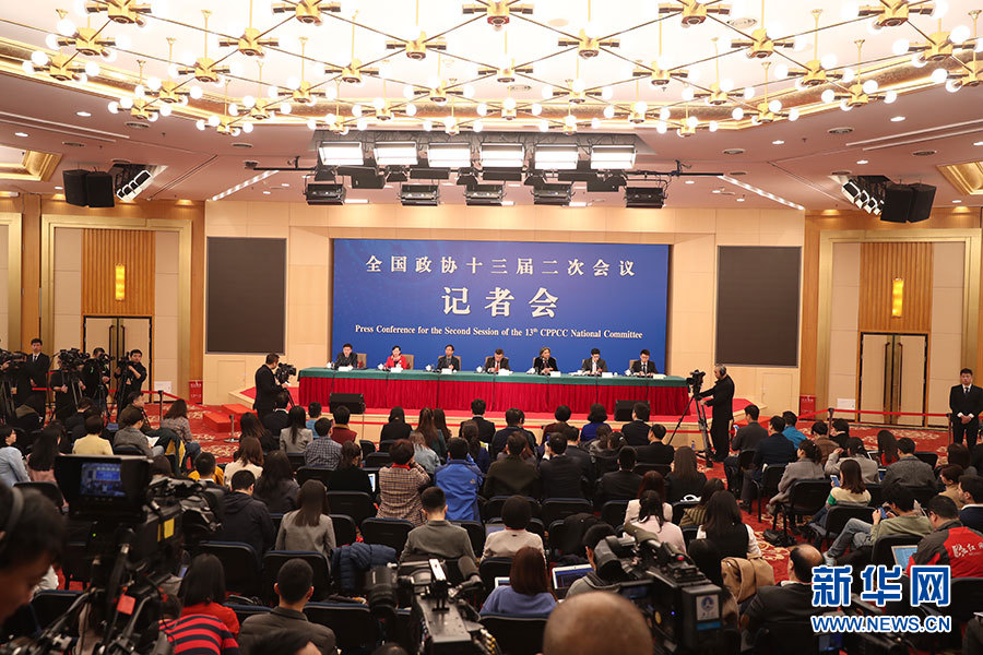 全國政協十三屆二次會議3月10日(星期日)上午8:45在梅地亞兩會新聞中心舉行記者會,邀請5位政協委員就“新時代政協履職”回答記者提問。圖為記者會現場。新華網、中國政府網進行現場直播。新華網/中國政府網 劉廈攝