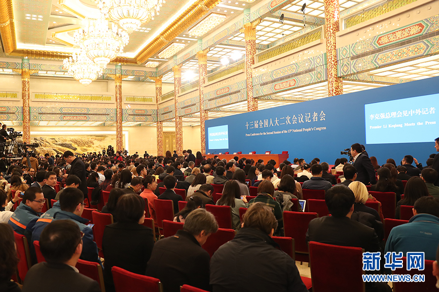 3月15日上午十三屆全國人大二次會議閉幕后,國務院總理李克強在人民大會堂三樓金色大廳會見采訪十三屆全國人大二次會議的中外記者并回答記者提出的問題。圖為記者會現場。新華網/中國政府網?陳杰 攝?