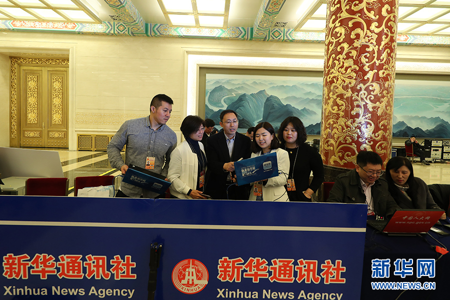 3月15日上午十三屆全國人大二次會議閉幕后,國務院總理李克強在人民大會堂三樓金色大廳會見采訪十三屆全國人大二次會議的中外記者并回答記者提出的問題。圖為新華網記者在做直播準備。新華網/中國政府網 劉廈 攝