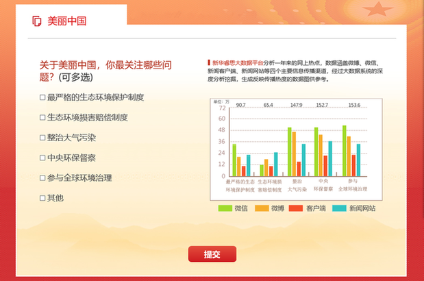 綠水青山是你我都關注的熱點。在新華網推出的2019全國兩會熱點調查中,新華睿思大數據通過監測新聞網站、論壇、微信、微博、APP、平媒6個信源,分析結果顯示,全國兩會開幕以來,關于生態環境的話題共832 4987個。