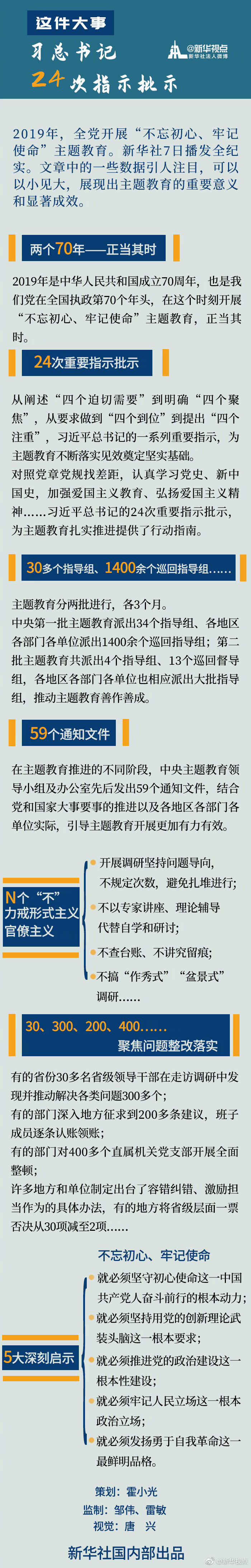為組織指導主題教育聚焦主題主線開展,中央第一批主題教育派出34個指導組、各地區各部門各單位派出1400余個巡回指導組,實現主題教育督促指導全覆蓋;第二批主題教育共派出4個指導組、13個巡回督導組,各地區各部門各單位也相應派出大批指導組,引導正確方向,精準發現問題,推動主題教育善作善成。