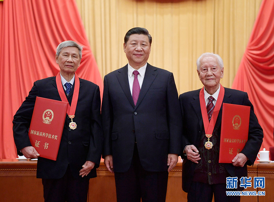 1月10日,2019年度國(guó)家科學(xué)技術(shù)獎(jiǎng)勵(lì)大會(huì)在北京人民大會(huì)堂隆重舉行。中共中央總書記、國(guó)家主席、中央軍委主席習(xí)近平向獲得2019年度國(guó)家最高科學(xué)技術(shù)獎(jiǎng)的原中國(guó)船舶重工集團(tuán)公司第七一九研究所黃旭華院士(右)和中國(guó)科學(xué)院大氣物理研究所曾慶存院士(左)頒獎(jiǎng)。 新華社記者 李學(xué)仁 攝