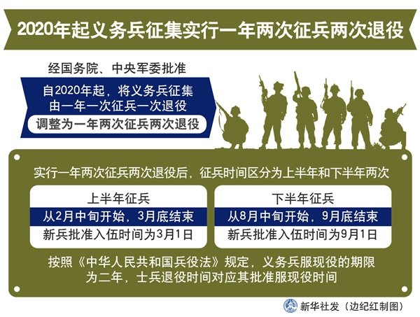 新華社北京1月16日電(記者賈啟龍)經(jīng)國(guó)務(wù)院、中央軍委批準(zhǔn),自2020年起,將義務(wù)兵征集由一年一次征兵一次退役,調(diào)整為一年兩次征兵兩次退役。