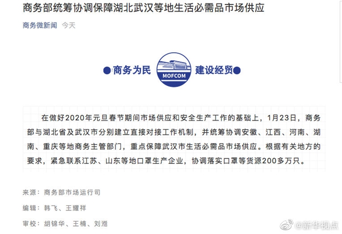 記者從商務部了解到,23日,商務部統籌協調安徽、江西、河南、湖南、重慶等地商務主管部門,重點保障武漢市生活必需品市場供應。根據有關地方的要求,緊急聯系江蘇、山東等地口罩生產企業,協調落實口罩等貨源200多萬只。(記者王雨蕭、陳煒偉)?