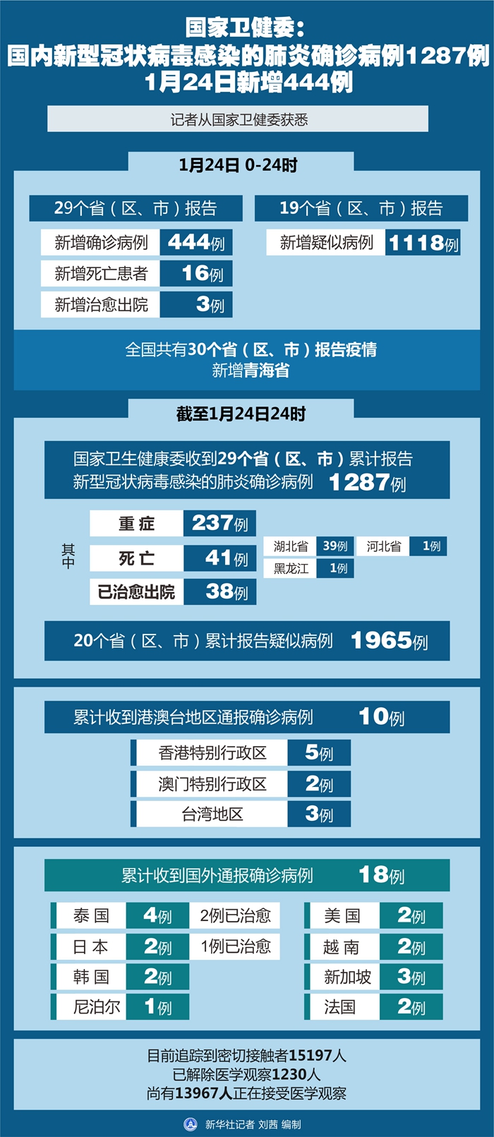 截至1月24日24時,國家衛健委收到29個?。▍^、市)累計報告新型冠狀病毒感染的肺炎確診病例1287例,其中重癥237例,死亡41例(湖北省39例、河北省1例、黑龍江1例)。已治愈出院38例。20個省(區、市)累計報告疑似病例1965例。