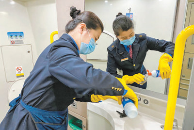 為應對疫情,鐵路部門全力做好相關防控工作。圖為南昌開往南京的G1496次列車上,南昌客運段工作人員認真做好車廂清潔、消毒工作。鮑贛生攝(人民視覺)