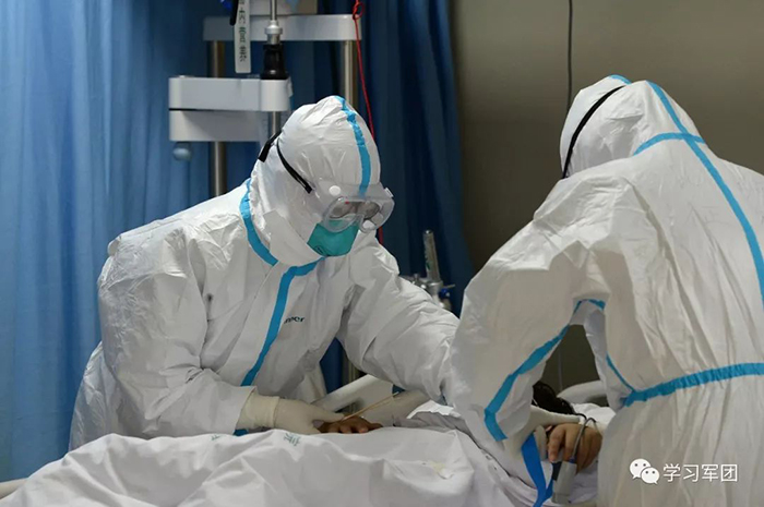 1月27日上午,海軍軍醫(yī)大學(xué)醫(yī)療隊(duì)醫(yī)護(hù)人員在漢口醫(yī)院重癥監(jiān)護(hù)室對(duì)新型冠狀病毒感染的肺炎患者進(jìn)行救治。醫(yī)護(hù)人員查看患者輸液導(dǎo)管是否通暢。解放軍報(bào)記者范顯海攝