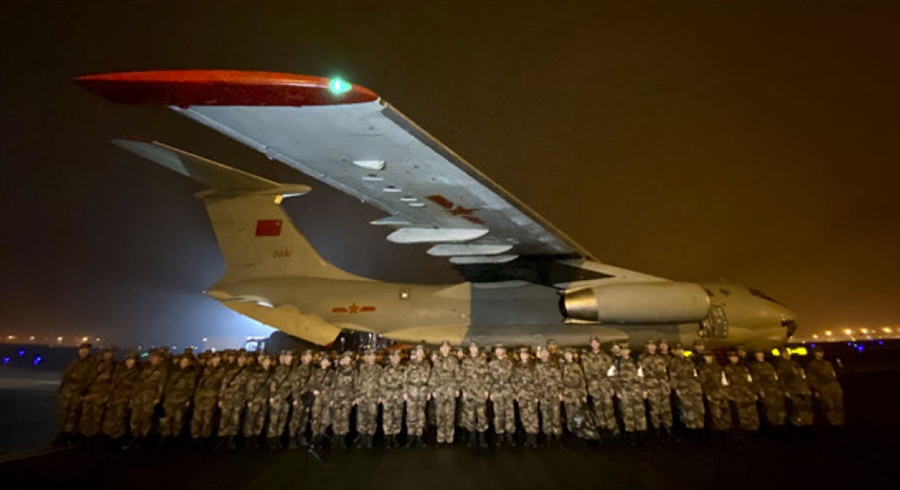 1月24日晚,由陸軍軍醫(yī)大學(xué)抽調(diào)精干醫(yī)務(wù)人員組建的醫(yī)療隊在重慶江北國際機(jī)場停機(jī)坪集結(jié),準(zhǔn)備連夜馳援武漢。 新華社發(fā)