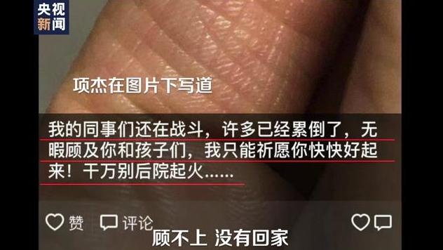項杰在微信朋友圈寫道:“我的同事們還在戰斗,許多已經累倒了,無暇顧及你和孩子們,我只能祈愿你快快好起來!千萬別后院起火。”