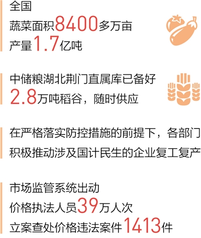 連日來,各部門積極組織蔬菜等副食品生產,確保蔬菜、肉蛋奶、糧食等居民生活必需品供應,加強統籌協調,保障煤電油氣供應。同時,依法嚴厲打擊利用疫情哄抬物價、囤積居奇、趁火打劫等擾亂社會秩序的違法犯罪行為。目前,全國生活必需品市場供應總體充足、價格穩定。全國路網保障和運行良好,物資運輸整體有序。