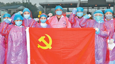 2月5日,在湖南益陽(yáng)市高速公路鄧石橋出口,參與對(duì)乘車人進(jìn)行體溫監(jiān)測(cè)的康雅醫(yī)院黨員重溫入黨誓詞。為發(fā)揮黨員的模范帶頭作用,益陽(yáng)各交通要道路口、車站卡口工作人員成立了臨時(shí)黨支部,設(shè)立了黨員示范崗。宣國(guó)祥攝(人民視覺(jué))