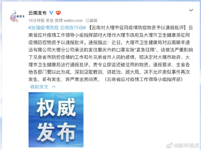 記者獲悉,云南省應對疫情工作領導小組指揮部對大理州大理市政府及大理市衛生健康局征用疫情防控物資予以通報批評。