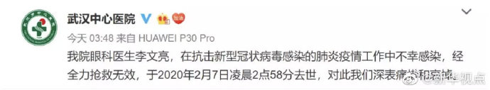 據@武漢中心醫院消息:武漢中心醫院眼科醫生李文亮,在抗擊新型冠狀病毒感染的肺炎疫情工作中不幸感染,經全力搶救無效,于2020年2月7日凌晨2點58分去世,對此,醫院方面深表痛惜和哀悼。