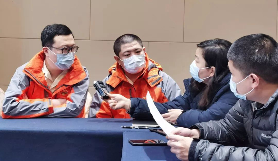 關宏奎(左二)和同事一起接受本臺記者勁清的采訪