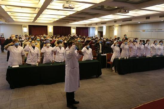 1月27日,在武漢市蔡甸區(qū)執(zhí)行新型冠狀病毒肺炎疫情援助任務(wù)的遼寧省醫(yī)療隊,成立臨時黨支部,全體醫(yī)護人員向黨旗鄭重宣誓,堅決打贏新冠肺炎疫情防控阻擊戰(zhàn)。