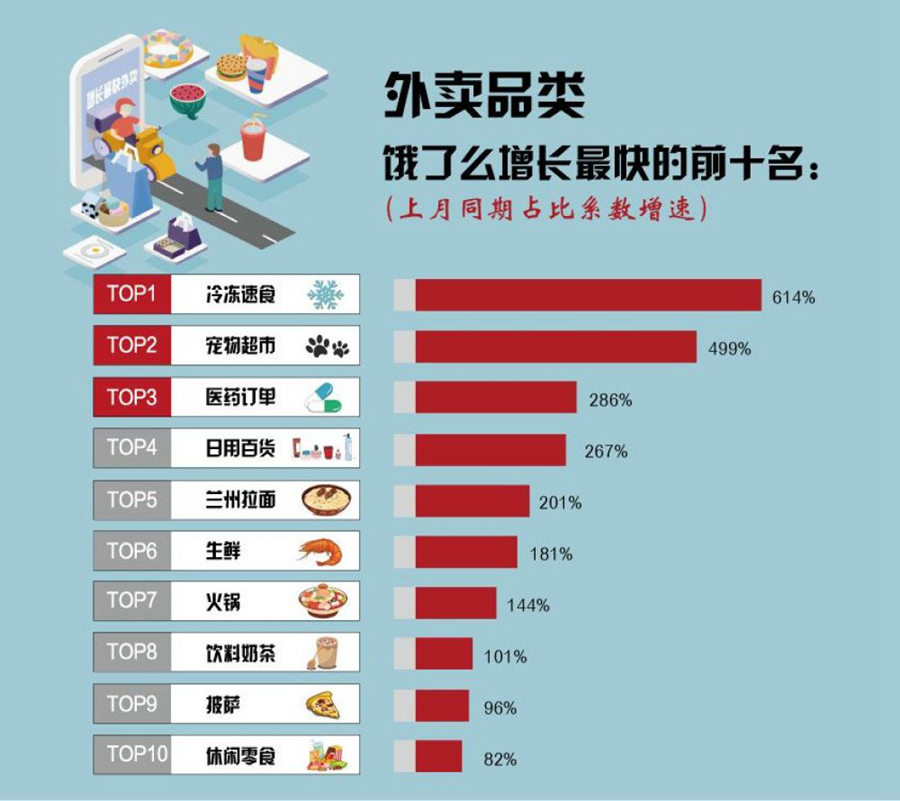 1.環(huán)比12月份,冷凍速食增長了6倍,是目前“餓了么”平臺外賣品類中占比增長最快的一個品類。