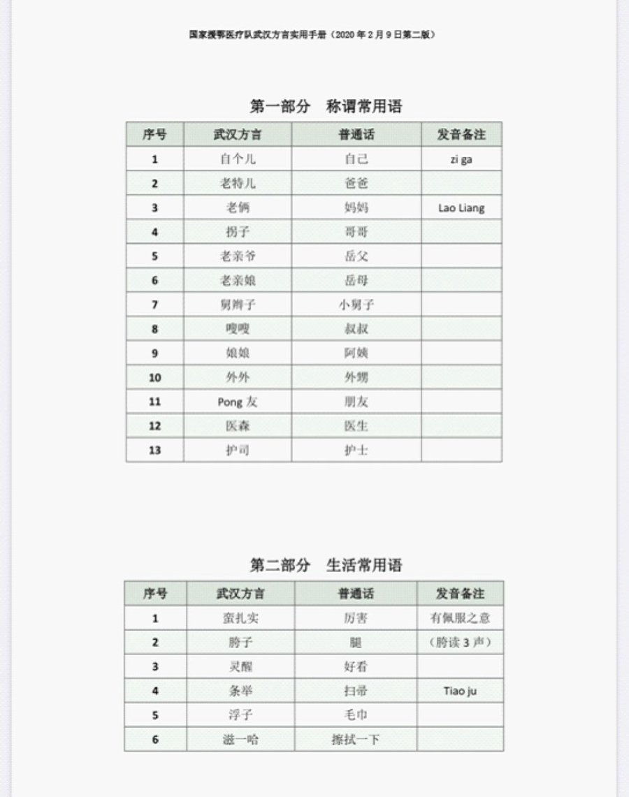 《國家援鄂醫療隊武漢方言實用手冊》