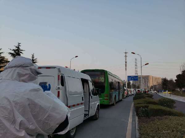車子行駛到金銀潭醫院附近,距離“武漢客廳”還一公里多,大量車輛出現了:除了救護車,還有另一輛改裝的皮卡,頂蓋上同樣纏著紅藍相間的蛇皮袋;還有公交車。據城管隊員說,這些都是各街道來“方艙醫院”送病人的。