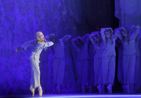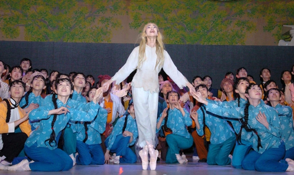 2004年12月28日,為慶祝日本松山芭蕾舞團理事長清水正夫獲得中國“文化交流貢獻獎”,日本松山芭蕾舞團在東京上演現代芭蕾舞劇《白毛女》,第二代白毛女扮演者森下洋子(中)在舞劇《白毛女》中飾演“喜兒”。 新華社記者馬平攝