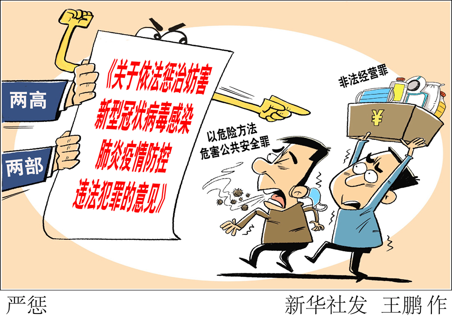 2月10日,最高人民法院、最高人民檢察院、公安部、司法部聯(lián)合發(fā)布關(guān)于依法懲治妨害新型冠狀病毒感染肺炎疫情防控違法犯罪的意見(jiàn),針對(duì)當(dāng)前突出的涉疫情防控違法犯罪,統(tǒng)一執(zhí)法標(biāo)準(zhǔn)、程序、依據(jù),并強(qiáng)調(diào)加強(qiáng)治安管理、市場(chǎng)監(jiān)管等執(zhí)法工作,加大對(duì)暴力傷醫(yī)違法犯罪行為打擊力度。 新華社發(fā) 王鵬 作