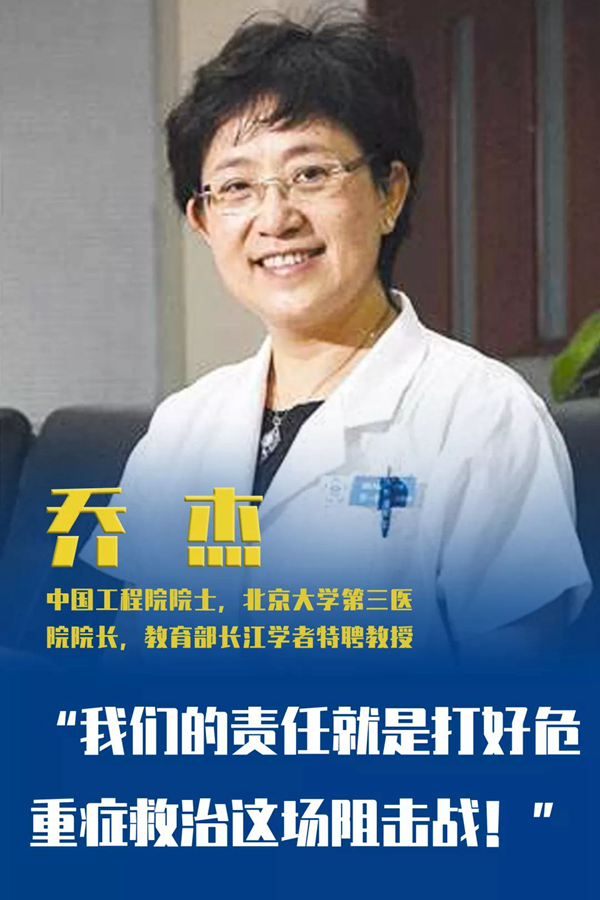 北京大學自創建以來,始終與國家和民族同呼吸共命運。此次新冠狀病毒感染疫情嚴重,情況危急。北大迅速派出附屬醫院的多批醫療隊馳援武漢。截止到2月13日,北大援鄂抗疫國家醫療隊已累計收治危重癥患者200余例,而作為領導組組長,喬杰也已在武漢駐守12天。她協同各院領導和專家組成員,迅速梳理工作流程,從管理體制建立、到病房改造,再到人員培訓,儀器設備調配,每一細節嚴格把關。她帶領團隊充分發揮北大醫學多學科合作優勢,為提高新冠肺炎危重患者治愈率,降低病亡率履行著應盡的職責。