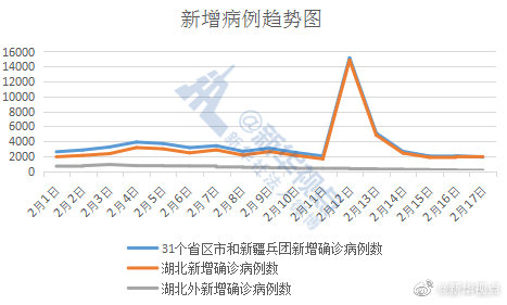 2月17日,31個省(自治區、直轄市)和新疆生產建設兵團報告新增新冠肺炎確診病例1886例,湖北新增確診病例1807例。這就是說,除湖北外的30個省區市和新疆生產建設兵團昨日新增確診79例,這是自2月3日來新增病例到達高點890例以來的首次兩位數報告,也是第14連降。?
