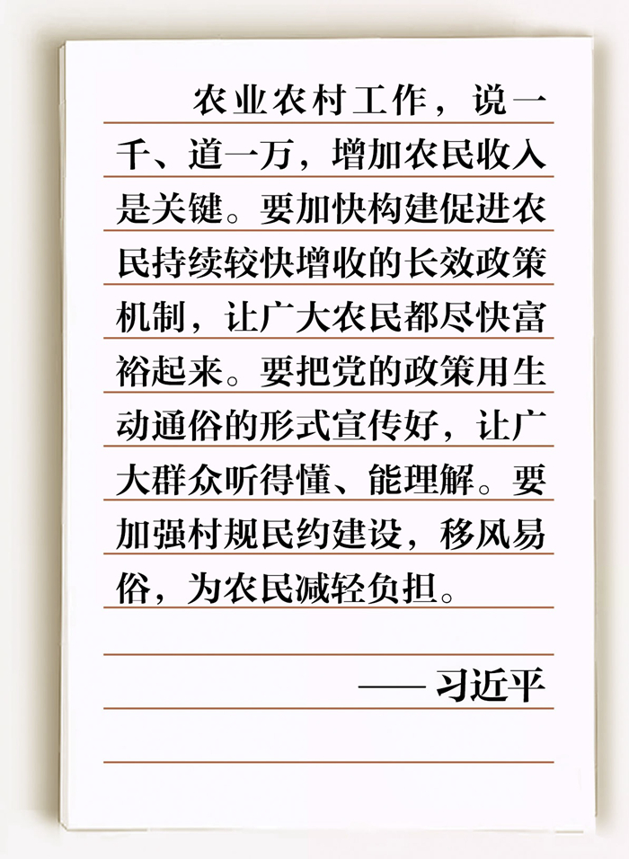 “致富路越走越寬,日子越過越紅火,全靠黨的政策好??倳浉吲d地說,農業農村工作,說一千、道一萬,增加農民收入是關鍵。”
