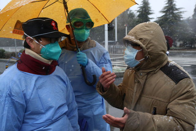 2月15日,武漢東西湖方艙醫(yī)院,武漢大學(xué)中南醫(yī)院副院長、東西湖方艙醫(yī)院副院長李志強(qiáng)(左一)在雪中等待為治愈患者發(fā)放出院證明。趙迪/攝