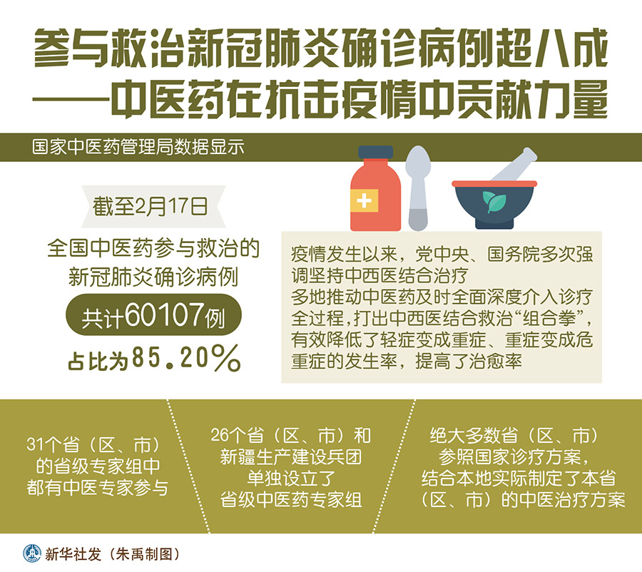 國(guó)家中醫(yī)藥管理局?jǐn)?shù)據(jù)顯示,截至2月17日,全國(guó)中醫(yī)藥參與救治的新冠肺炎確診病例共計(jì)60107例,占比為85.20%。疫情發(fā)生以來,黨中央、國(guó)務(wù)院多次強(qiáng)調(diào)堅(jiān)持中西醫(yī)結(jié)合治療。多地推動(dòng)中醫(yī)藥及時(shí)全面深度介入診療全過程,打出中西醫(yī)結(jié)合救治“組合拳”,有效降低了輕癥變成重癥、重癥變成危重癥的發(fā)生率,提高了治愈率。