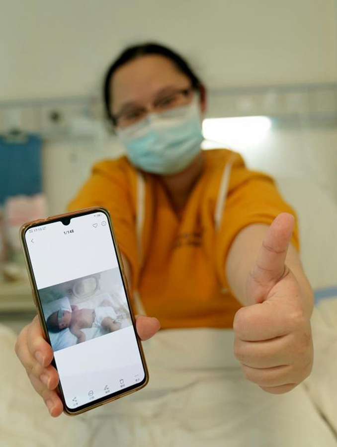 2月18日,楊女士展示手機中自己兒子的照片。在武漢華中科技大學(xué)同濟醫(yī)院中法新城院區(qū)新冠肺炎重癥病區(qū)住院的楊女士是武漢人,在身患新冠肺炎后剖腹產(chǎn)下一名男嬰。嬰兒目前在醫(yī)院進行隔離觀察,但各項指標(biāo)均正常。當(dāng)楊女士知道孩子的情況后,懸著的心終于放下。在醫(yī)護人員的努力下,她的病情也有了好轉(zhuǎn)。新華社記者王毓國 攝