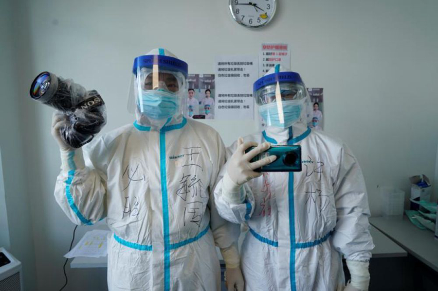 2月18日,新華社記者王毓國(左)、許楊在華中科技大學(xué)同濟醫(yī)院中法新城院區(qū)準(zhǔn)備進入隔離病房內(nèi)采訪。新華社記者 余國慶 攝