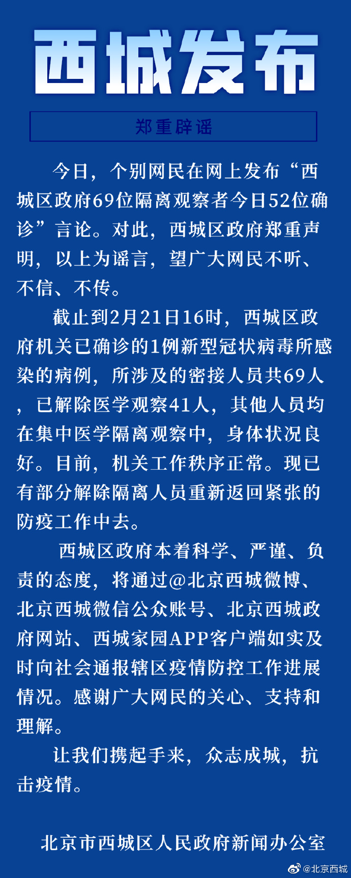 【鄭重辟謠:西城區(qū)政府69位隔離觀察者今日52位確診系謠言】望廣大網(wǎng)民不聽、不信、不傳,讓我們攜起手來,眾志成城,抗擊疫情。