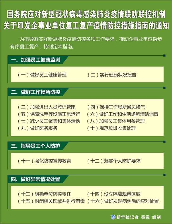 新華社北京2月22日電? 2月21日,國務院聯防聯控機制就指導落實新冠肺炎疫情防控各項工作要求,推動企事業單位穩步有序復工復產,印發《企事業單位復工復產疫情防控措施指南》。