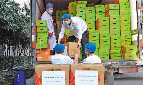 2月22日,湖北省武漢市江漢區武漢協和醫院,醫院工作人員在搬運云南捐贈的物資。各地捐贈物資為武漢抗擊新冠肺炎疫情提供了物資保障。本報記者 高興貴攝