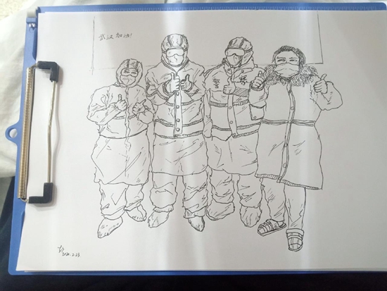 他把畫的“方艙生活”發(fā)到了微博上——兩位病人在床,護(hù)士俯身照顧。畫中醫(yī)院的墻上被他特意寫了四個(gè)字:“武漢加油。”(程盟超)