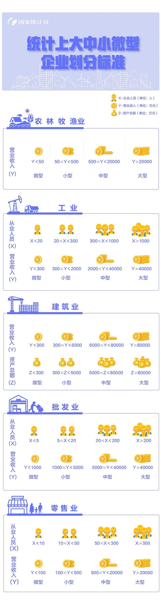 該辦法按照行業(yè)門類、大類、中類和組合類別,依據(jù)從業(yè)人員、營(yíng)業(yè)收入、資產(chǎn)總額等指標(biāo)或替代指標(biāo),將我國(guó)的企業(yè)劃分為大型、中型、小型、微型等四種類型。