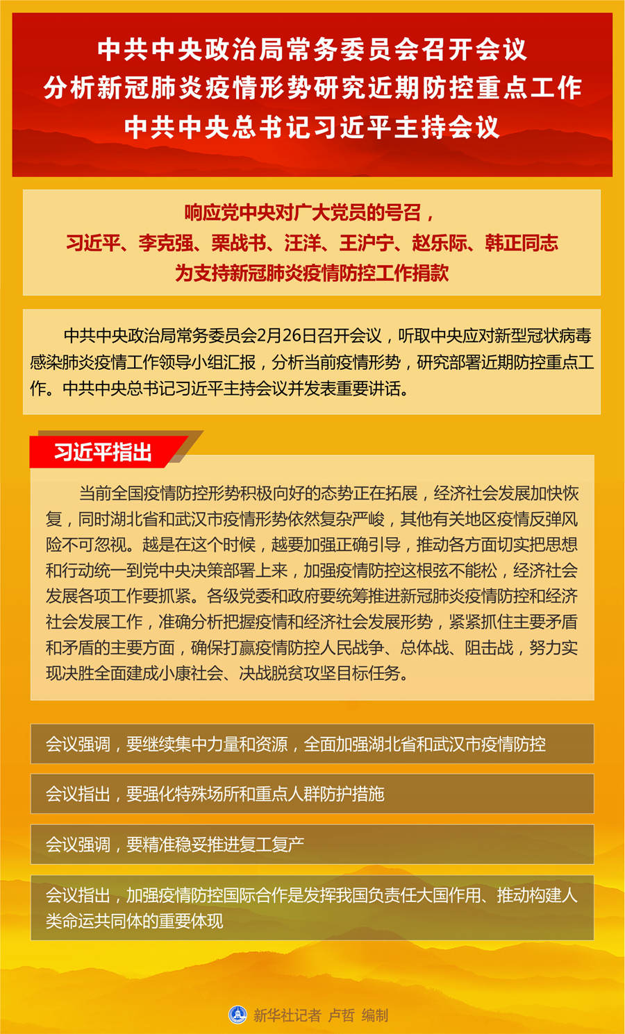 新華社北京2月26日電 中共中央政治局常務委員會2月26日召開會議,聽取中央應對新型冠狀病毒感染肺炎疫情工作領導小組匯報,分析當前疫情形勢,研究部署近期防控重點工作。中共中央總書記習近平主持會議并發表重要講話。