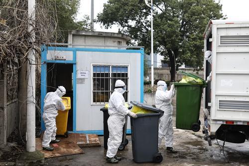 2月26日,湖北省武漢市,幾名醫療廢物處理員在搬運醫療垃圾。中青報·中青網記者 趙迪/攝