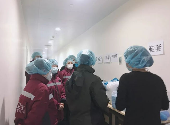 到了武漢大學人民醫院,我們在清潔區的通道里換防護服,洗手衣+防護服+隔離衣+自己的衣服,一共四層。再戴上兩個口罩和一個護目鏡。