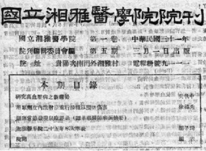 日軍在常德發動細菌戰。譚學華、呂靜軒、鄧一韙、陳文貴等湘雅人及時發現病例,并積極采取防疫措施避免了鼠疫大規模流行。《國立湘雅醫學院院刊》是第一份向世人揭露日軍發動常德細菌戰暴行的刊物。