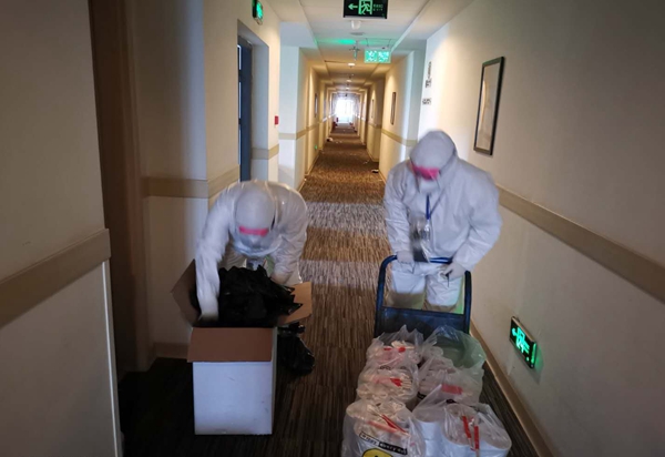 走馬嶺“康復驛站”負責人、走馬嶺街工委副書記陶勇介紹,目前整個東西湖區共有5家“康復驛站”。由于走馬嶺“康復驛站”此前作為兩次檢測轉陰患者的“待出院隔離觀察點”,所以酒店已經按照“三區兩通道”要求進行了改造。昨天入住的出院患者來自各個醫院,包括火神山醫院、東西湖區人民醫院、兒童醫院以及各個方艙醫院,由區里和街道調配車輛完成轉運。陶勇說:“因為這里最開始作為‘雙陰’的一個待出院隔離點,所以就按照‘三區兩通道’的格局來制定。一個是病人的通道,另一個是醫生的通道,病人走了以后,我們進行殺毒、登記,然后安排到酒店的房間。我們旁邊也征用了一個別人的公司,在上面打通了一個連接酒店那邊的通道?!?/p>