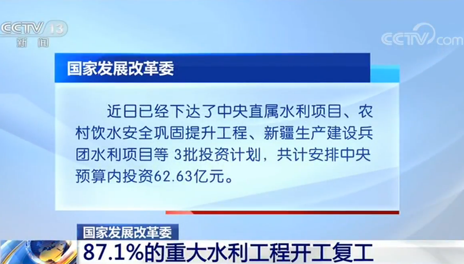 國家發展改革委近日已經下達了中央直屬水利項目、農村飲水安全鞏固提升工程、新疆生產建設兵團水利項目等3批投資計劃,共計安排中央預算內投資62.63億元。