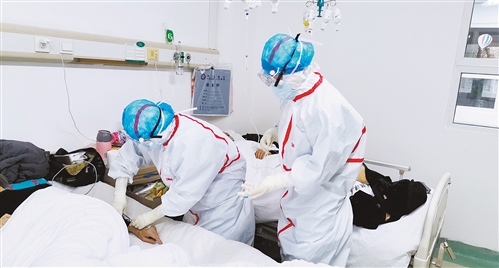 奮戰在武漢金銀潭醫院南一區的國家中醫醫療隊大夫們正在為患者診治。(資料照片)