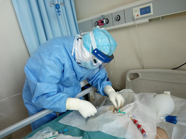 調整狀態、做好防護、熟悉工作,張雙圓穩扎穩打,很快就恢復了斗志。重癥病房里那個年輕戰士的身影隨處可見。穿著厚重的防護設備為患者穿刺、抽血、輸液、靜推、俯臥位,他不怕累。為氣管插管患者霧化吸痰時被呼吸機管道內的異物噴濺到,他不畏懼。看到患者被病毒折磨到想放棄,他不接受。