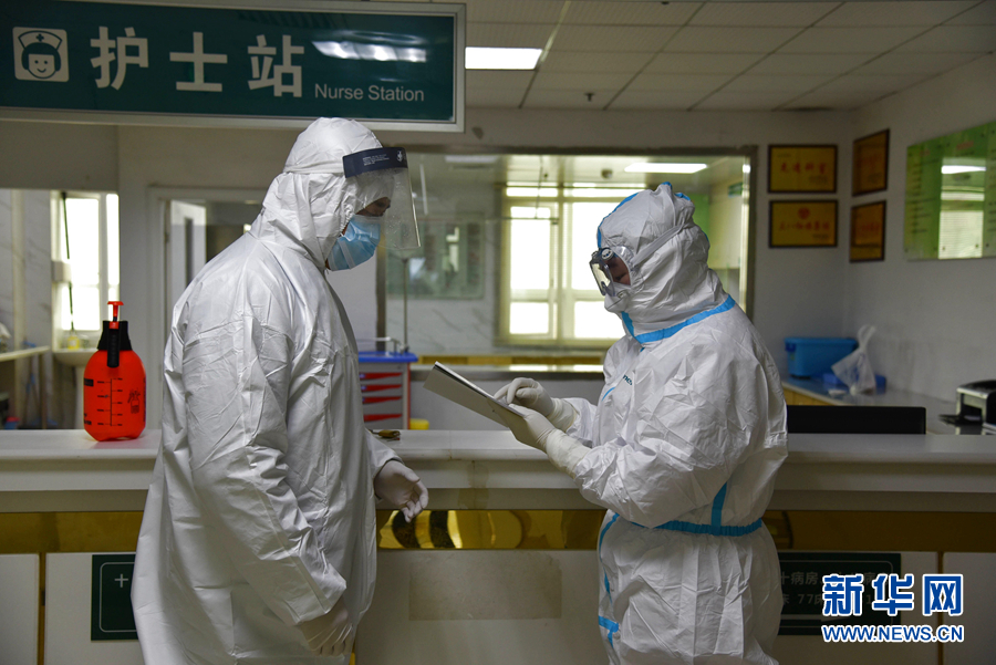 2月13日,湖北省榮軍醫(yī)院黃海明醫(yī)生(左)與退役軍人事務(wù)系統(tǒng)援助湖北醫(yī)療隊隊員、江西省榮軍醫(yī)院醫(yī)生、退役軍人晏鑫鵬做工作交接。 新華社發(fā)(朱玲玲 攝)