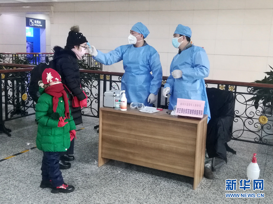 2月14日,黑龍江哈爾濱68名自主擇業(yè)軍轉(zhuǎn)干部組成的“橄欖綠疫情防控志愿服務(wù)隊”隊員在火車站為旅客測量體溫。 新華社發(fā)(韓振忠 攝)